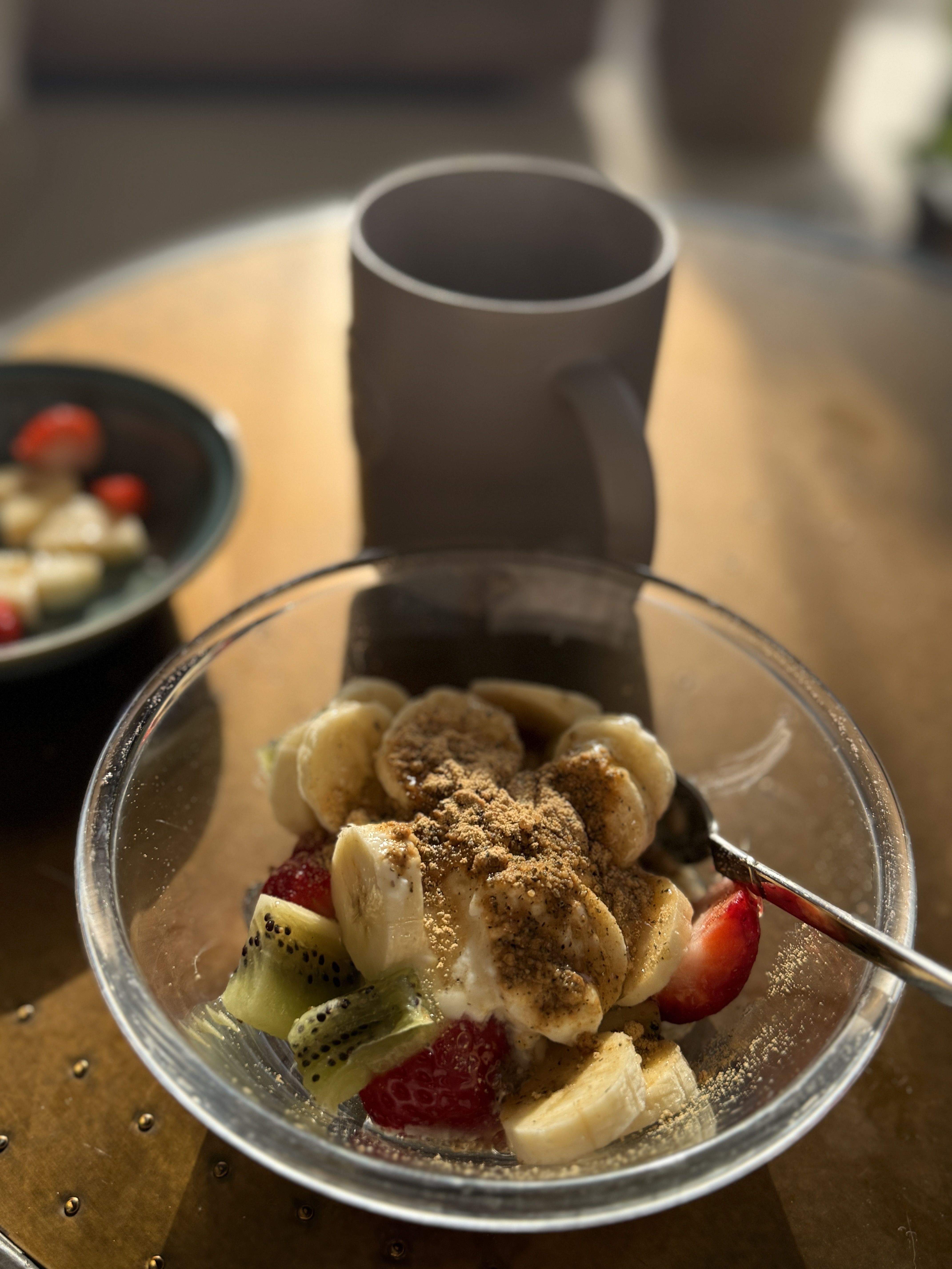 その後軽く朝ごはん。 朝はいつもフルーツ乗せたグラノラヨーグルトをテレビを見ながら。