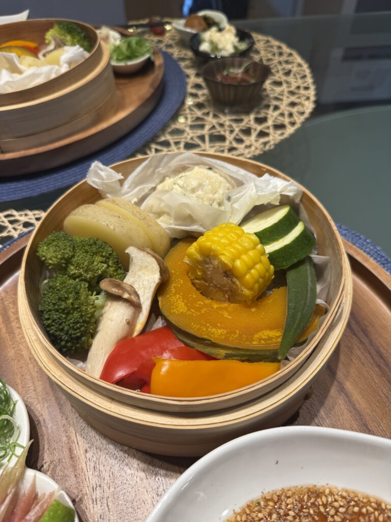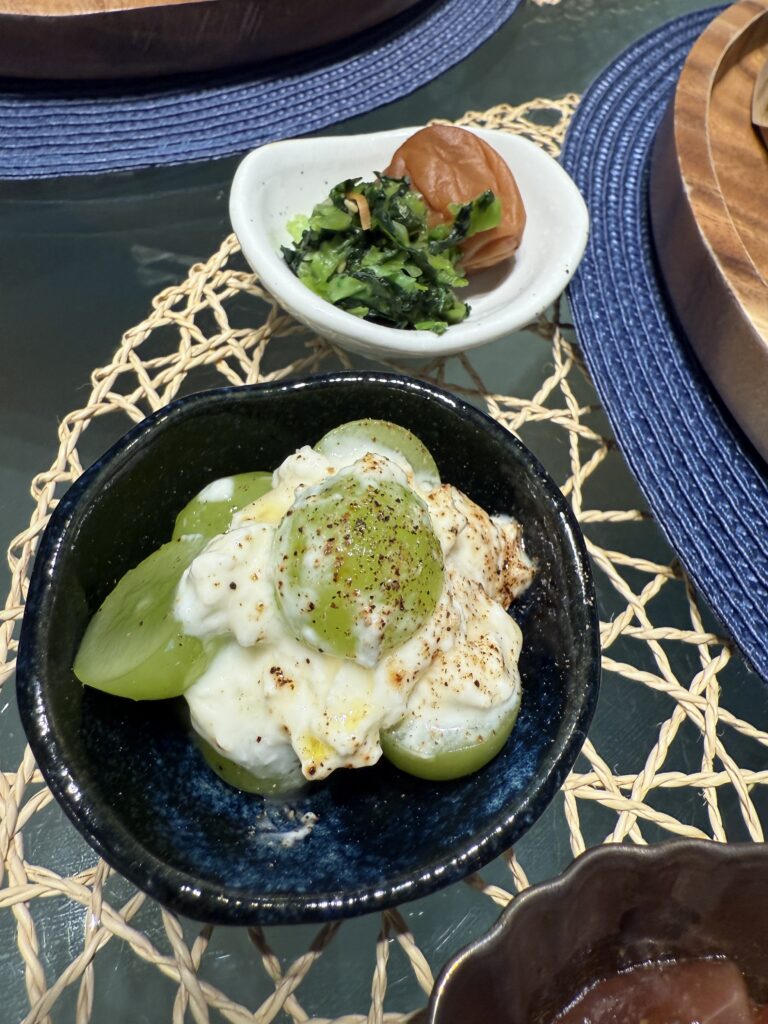 たっぷり野菜と鳥団子の蒸篭蒸し、シャインマスカットのクリームチーズ和え、まぐろの漬け・・・・